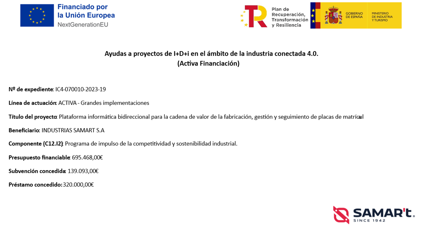 De acuerdo con las medidas de publicidad definidas en el artículo 34 de la Orden ICT/713/2021, así como las referidas en el artículo 2 de la citada Orden, SAMAR’T, a través de la Convocatoria de concesión de ayuda a proyectos de Investigación, Desarrollo e innovación en el ámbito de la Industria Conectada 4.0. (ACTIVA_Financiación) en el marco del PRTR, del programa ACTIVA – Grandes Implementaciones, promovido por el Ministerio de Industria, Comercio y Turismo y la Secretaría General de Industria y de la Pequeña y Mediana Empresa, Samar’t ha llevado a cabo un importante proyecto de digitalización en el ámbito de la fabricación y gestión de placas de matrícula.